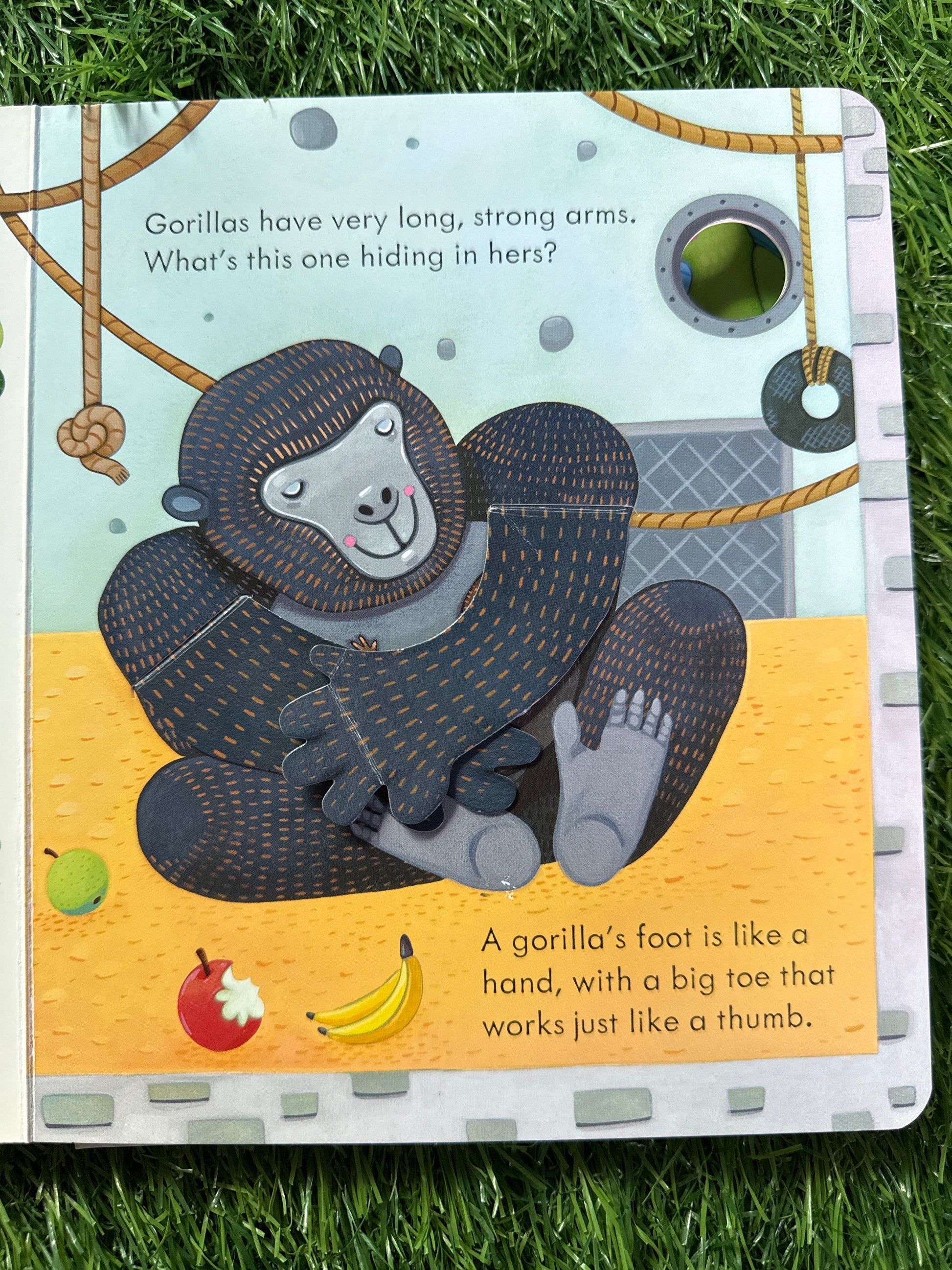Peep under leaves and behind doors to see the animals in the zoo in this delightful flap book for young children. With flaps and holes to peep underneath and through, noisy parrots, cheeky monkeys, very tall giraffes and lots more are revealed. Sure to become a firm favourite for young animal lovers.