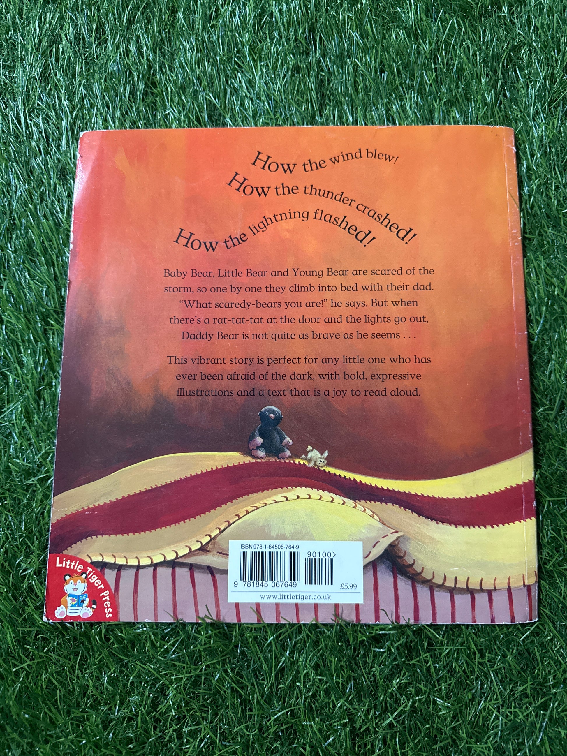 Baby Bear, Little Bear and Young Bear are scared of the storm. So one by one they climb into bed with their mum and dad. 'What scaredy-bears you are!' says Daddy Bear. But when there's a rat-tat-tat at the door and the lights go out, Daddy Bear is not quite as brave as he seems.