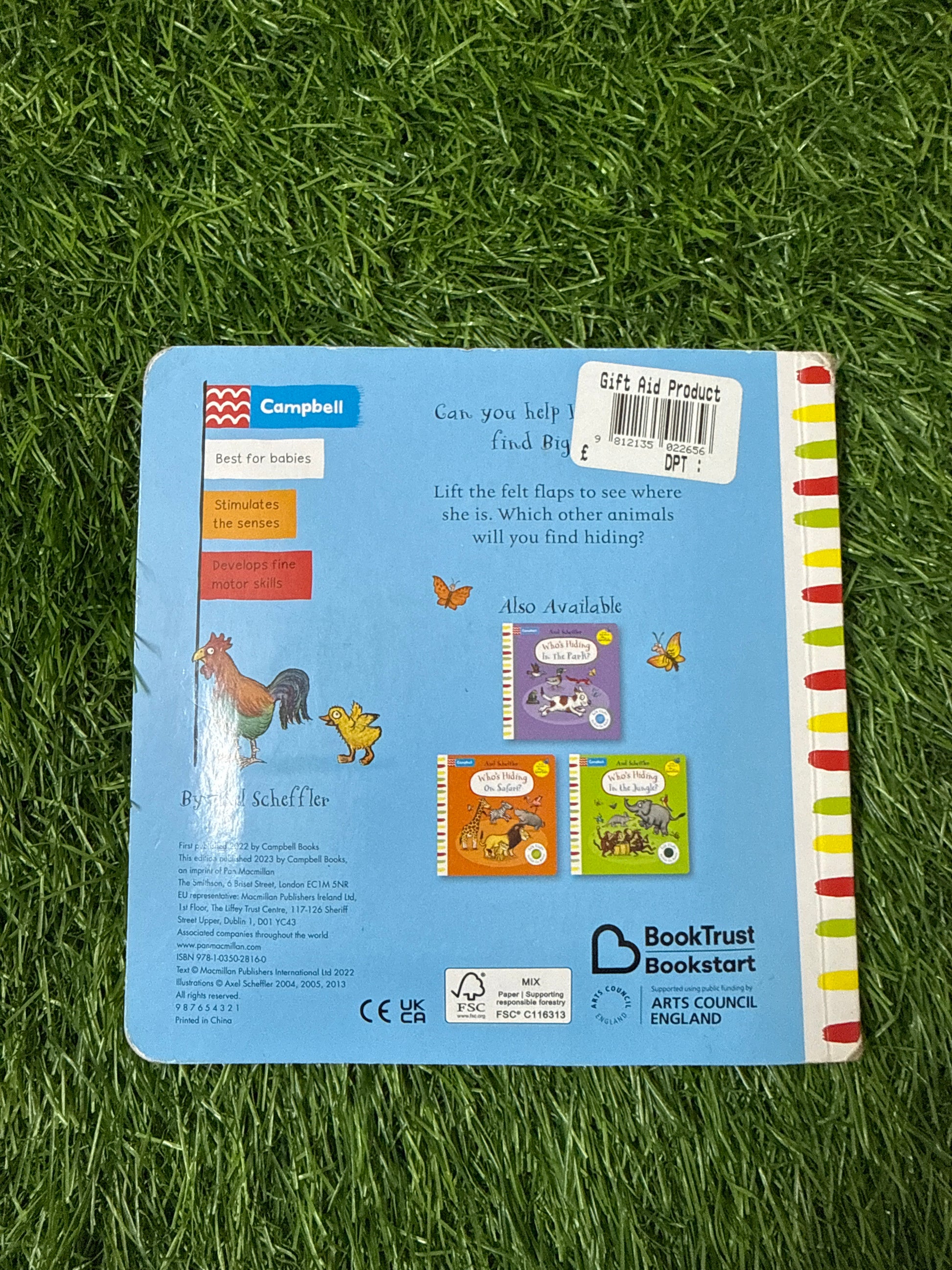 Help little chick look for Mummy hen in who's hiding on the farm? Lift the felt flaps to see where she is. Which other animals will you hiding underneath? With soft flaps on every spread that are easy for babies to lift, helping them develop fine motor skills, and illustrated by Axel Scheffler, bestselling illustrator of the Gruffalo, this is the perfect gift to share with little ones. Discover more animal adventures from Axel Scheffler: Freddy the Frog, in the jungle and the My First search and find: on the farm.